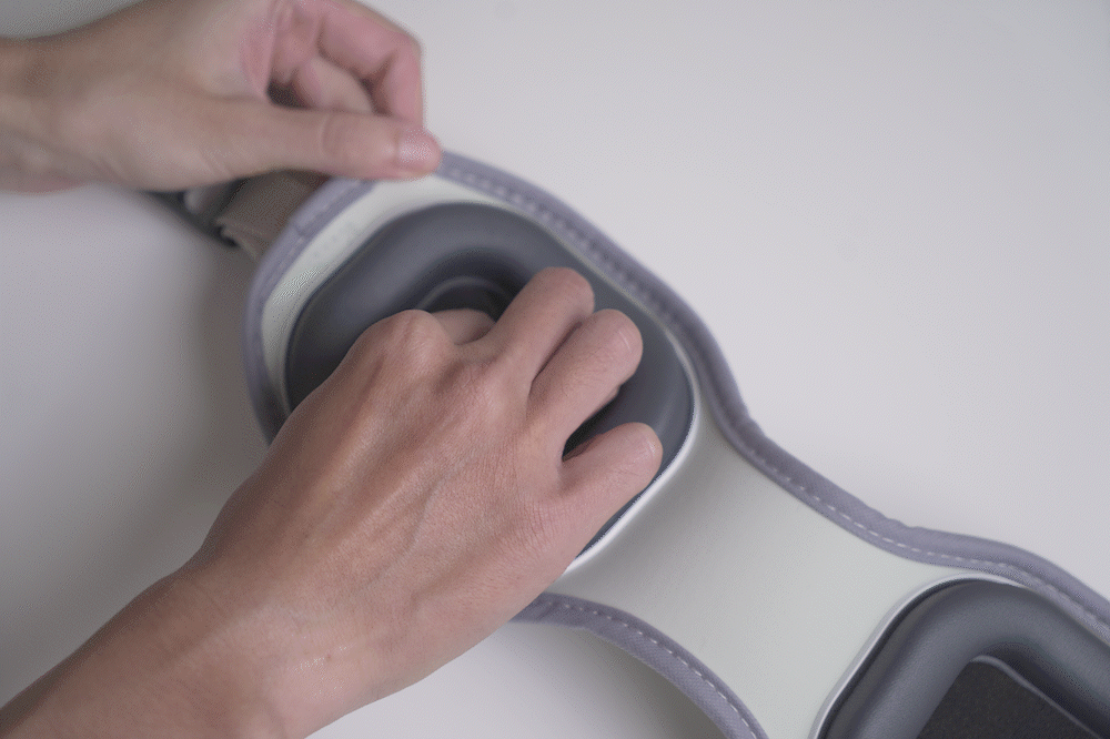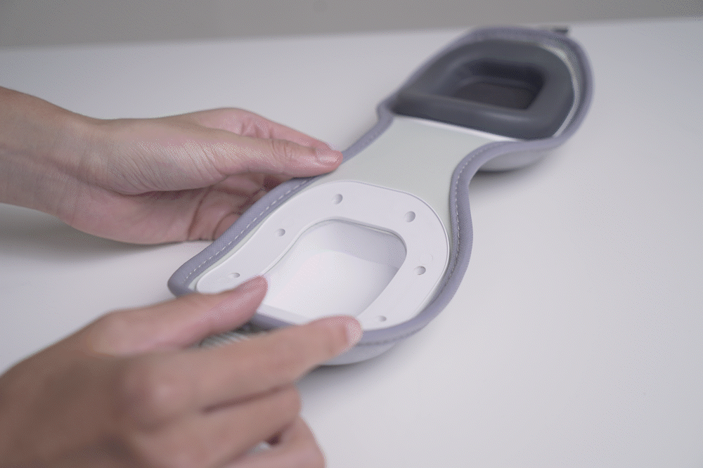 2. 將新的吸音海綿對齊耳墊內矩形方框處,使海綿方向與耳墊內方框處形狀相符後,將海綿向下壓緊以確保良好貼合。