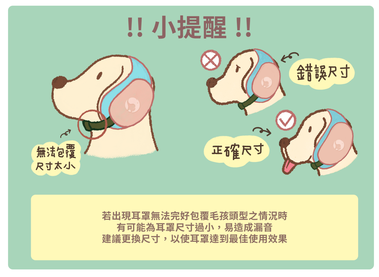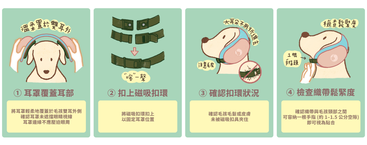 ● 若毛孩出現明顯不適、強烈抗拒、呼吸異常、持續抓咬耳罩或皮膚紅腫等情況,請立即停止使用並取下。