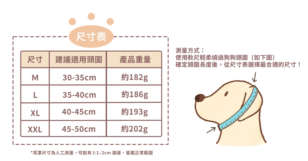 若毛孩頭圍介於兩個尺寸之間 (如 M,L的35cm),建議優先選購較小一號 (例:選 M 號)。較緊實的貼合能達到最佳隔音效果。